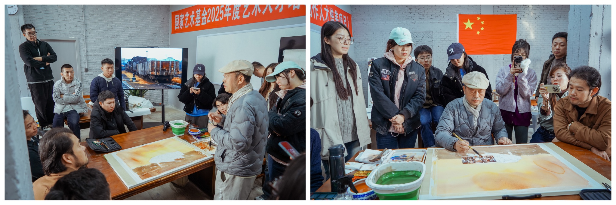 28日,崔全顺教授还通过创作作品的方式亲自为学员们示范创作技法。在基地的理论教室里,他的创作受到了学员们的围观。崔老师一边画,一边从构图、形式表达、画面元素的主次关系、空间节奏的把控、色彩与形式的协调统一等方面,及时与学员们进行分享。学员们也专注聆听、积极互动,围绕东北乡土题材的形式创新展开热烈讨论,在思维碰撞中拓宽创作视野,明晰创作方向。