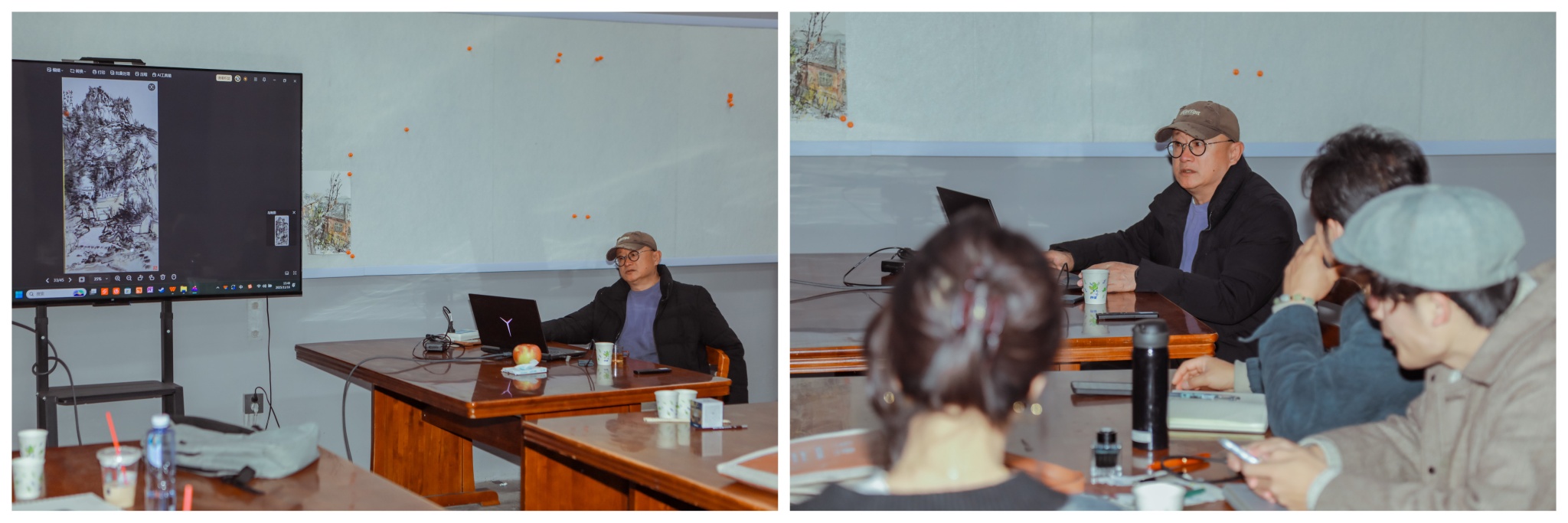 课后,高老师还在项目主持人、辽宁师范大学美术学院常伟廷副院长(主持工作)的陪同下来到画室,为每一位学员点评作品。“通过高老师的对比分析,我对东北山水的地域特色有了更清晰的认知,也明白了如何在创作中既借鉴传统养分,又突出地域个性。”一位来自东北本地的学员表示。此次课程不仅帮助学员们厘清了南北方山水画的艺术脉络,更强化了大家对“地域特色”在美术创作中重要性的理解,为后续开展东北地域乡土主题创作奠定了坚实的理论基础。